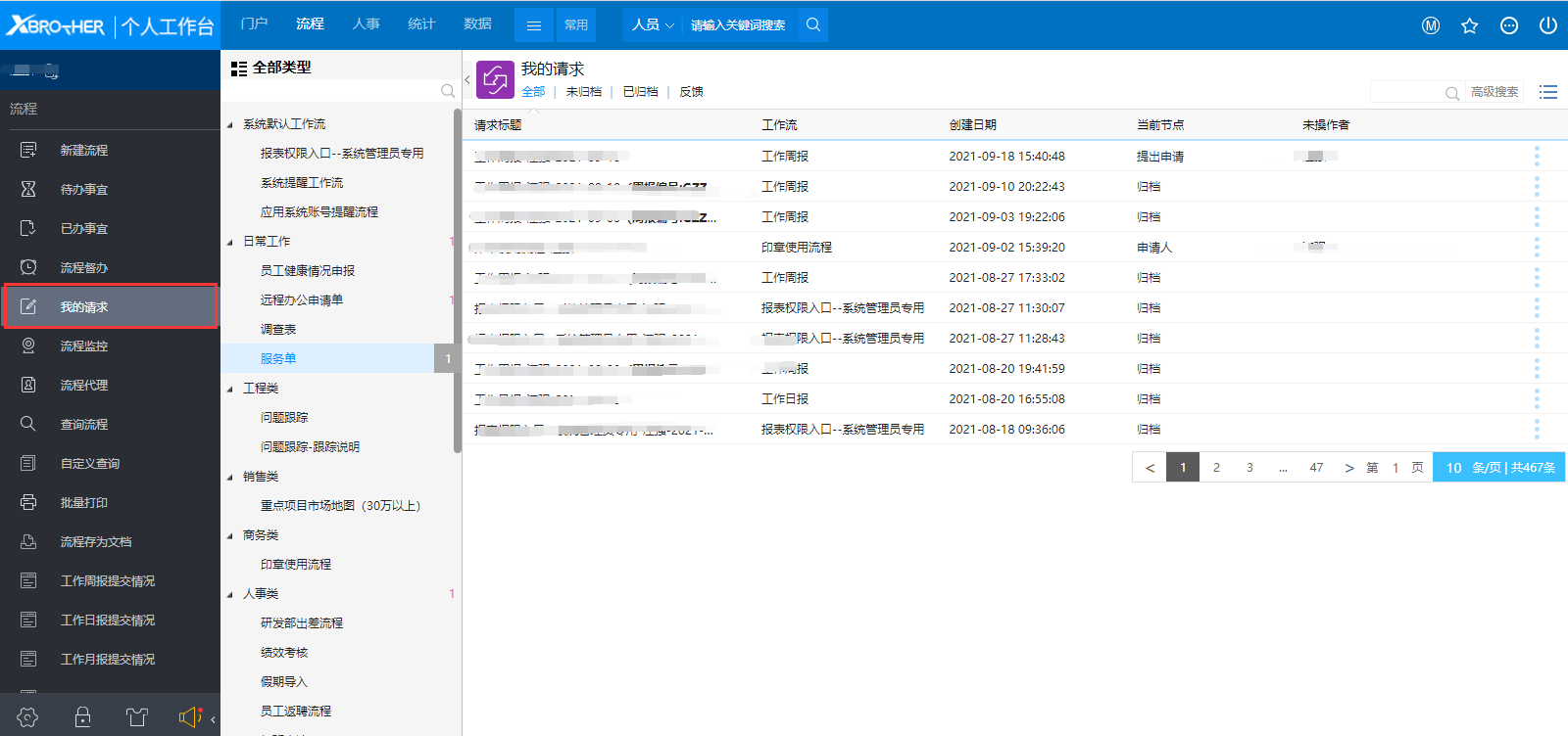 ### 一、概述 用户可以通过我的请求功能来跟踪流程处理情况。 ### 二、功能说明 点击前端应用中心菜单【流程】--【我的请求】,打开如图1所示的页面:  图1 - 默认展现【全部】标签页,可选标签页【未归档】、【已归档】和【反馈】,用于查看对应状态的流程。 - 点击可隐藏路径类型树。 - 右上角快捷查询可根据“请求标题”查询流程。 - 点击【高级搜索】,展开高级搜索。 - 对于我的请求,鼠标覆上列表行显示的常用操作选项有【打印】,对于未读的流程还有【标记为已读】功能,对于启用【记录表单修改日志】功能的流程,操作选项里还有【表单日志】。 ### 三、操作选项说明 1、**标记为已读**:对于未读的我的请求有此操作选项,已读的流程无此操作选项。 2、**表单日志**:点击可在打开的窗口中快捷查看节点表单的修改日志。 3、**打印**:【打印】即打印流程,点击可跳转到打印页面,与直接在打开的流程中打印效果一致。