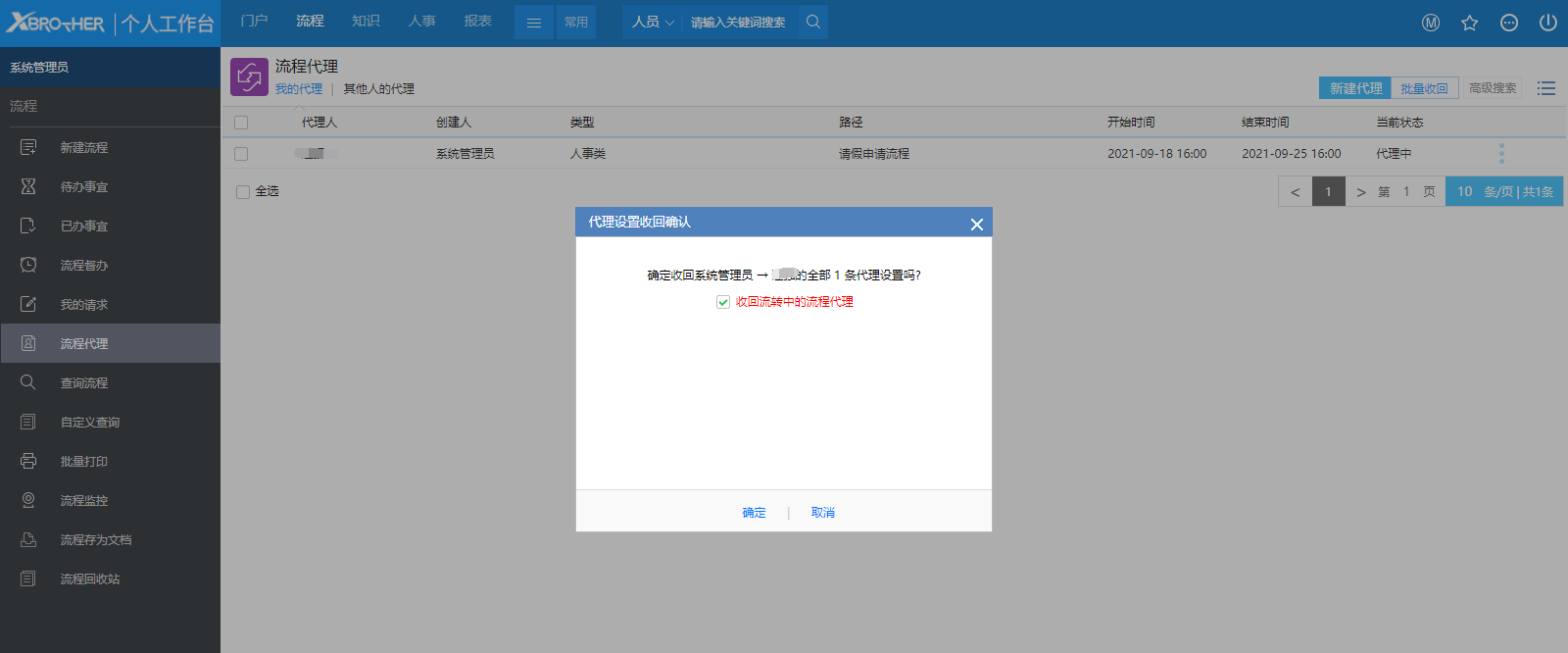 ### 一、概述 用户可能由于出差在外不方便处理流程时,可以通过流程代理将流程在指定的时间范围内交给其他同事处理。在流程有效期结束后会自动收回流程代理,如果被代理人希望提前收回代理,则可执行立即收回的操作。如果有收回流程代理的权限,那么也可以为其他人收回流程代理。 ### 二、功能说明 点击前端应用中心菜单【流程】--【流程代理】,打开如图1所示的页面:  图1 - 【我的代理】标签页显示了当前用户代理给其他人的代理设置。 - 【其他人的代理】标签页显示了其他人代理给自己或别人的代理设置。 - 点击【高级搜索】展开高级搜索条件,可对列表中的代理记录进行过滤查询,如图2所示:  图2 ### 三、新建代理 1、在图1所示页面中点击右上角【新建代理】按钮,打开如图3所示操作窗口:  图3 - 被代理人默认为当前操作的用户,如果拥有系统管理权限的话,可以选择其他用户,否则这个字段是不可编辑的; - 代理人是选择你要将你的流程交给谁操作,这里只能单选; - 开始日期时间是用来设置从什么时间开始代理关系,只有设定时间之后到达的流程才会流转到代理人那里,所以这个时间是很重要的,这样也是为了方便用户提前设置好代理关系以免人离开了无法操作系统,如果这里不设置开始时间的话代理关系立刻生效; - 结束日期时间是用来设置从什么时间之后代理关系无效,即设定的结束时间之后到达的流程将不会流转到代理人那里,这里如果不设置内容的话那么代理关系就不会结束; - 代理已有待办事宜是指代理关系生效时,将用户待办事宜中的流程代理出去,如果不开启那么待办事宜中的流程仍然在被代理人这里,只有新到的流程才会流转给代理人; - 代理流程范围是指将哪些流程代理出去,默认为全部,可以切换选择某些流程,可以将不同的流程在同一时间内代理给不同的人处理。 2、==需要特别说明的是代理关系不能重复代理== - 不能在同一时间将同一个流程代理给2个用户; - 不能将代理的流程再次代理给其他用户,即A用户将流程代理给了B用户,B用户只能将自己的流程代理给C用户,而不能将代理A处理的流程再次代理给C用户。 ### 四、收回代理 鼠标覆上列表行显示的操作选项有【收回此条代理】和【收回全部代理】: - 点击【收回此条代理】,弹出提示如图5所示,默认勾选“收回流转中的流程代理”:  图5 - 点击【收回全部代理】,弹出提示如图6所示,可收回此条流程所属路径下的所有流程,默认勾选上“收回流转中的流程代理”:  图6