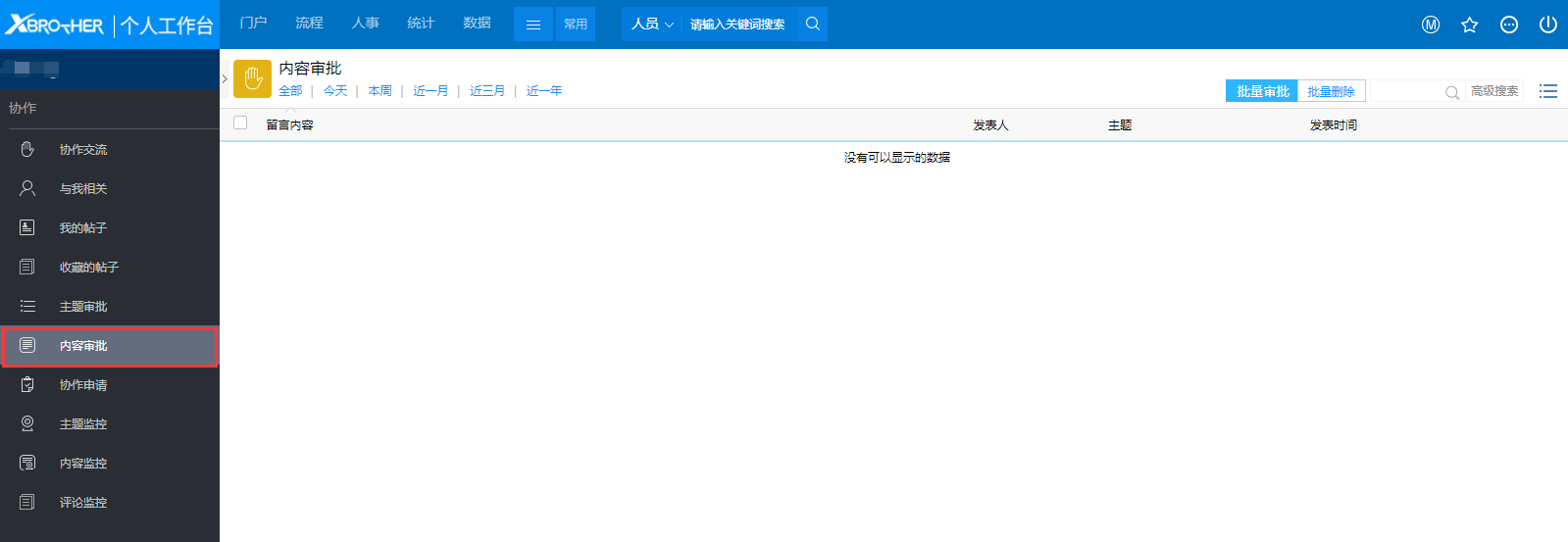 # 一、概述 内容审批是对协作主题内容进行控制,只有审批通过的内容才能被其他用户看到。 # 二、设置与审批 1、需要审批的内容与主题是相关的,如果主题所在的版块设置的是需要审批,开启审批后此版块下所有主题的内容都需要经过主题负责人审批后才能被大家看到。目前系统中都设置为无需审批 2、主题负责人点开【内容审批】菜单后可以看到如图1所示的页面,在这里可以进行内容的审批,也可到主题交流页面,直接对内容进行审批。 对待审批的内容可根据tab页中给出的时间段进行分类显示。 也可对待审批的内容进行删除,删除后,前台协作中之前发表的内容不会再有,显示为“内容被管理员删除”。  图1