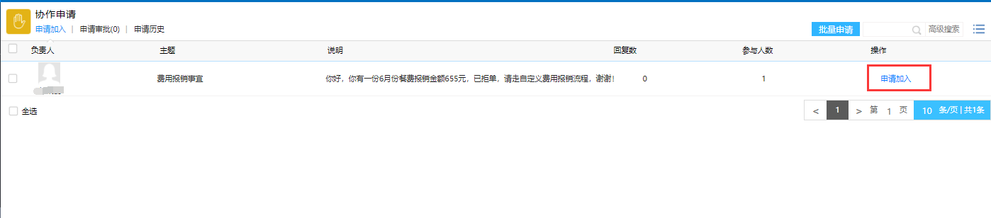 # 一、概述 在协作基本信息中设置为允许申请,原本无权限的人员想查看并参与到此协作时,可申请此协作,负责人同意后便可参与到此协作交流中。 # 二、设置与申请 如图1所示,主题负责人必需将主题的“允许申请”开关打开,其他用户如果不是此主题的参与者,才能在“协作申请”中看到这个主题,如果对主题的内容感兴趣的话,可以申请加入这个主题的讨论,如图2所示。  图1  图2