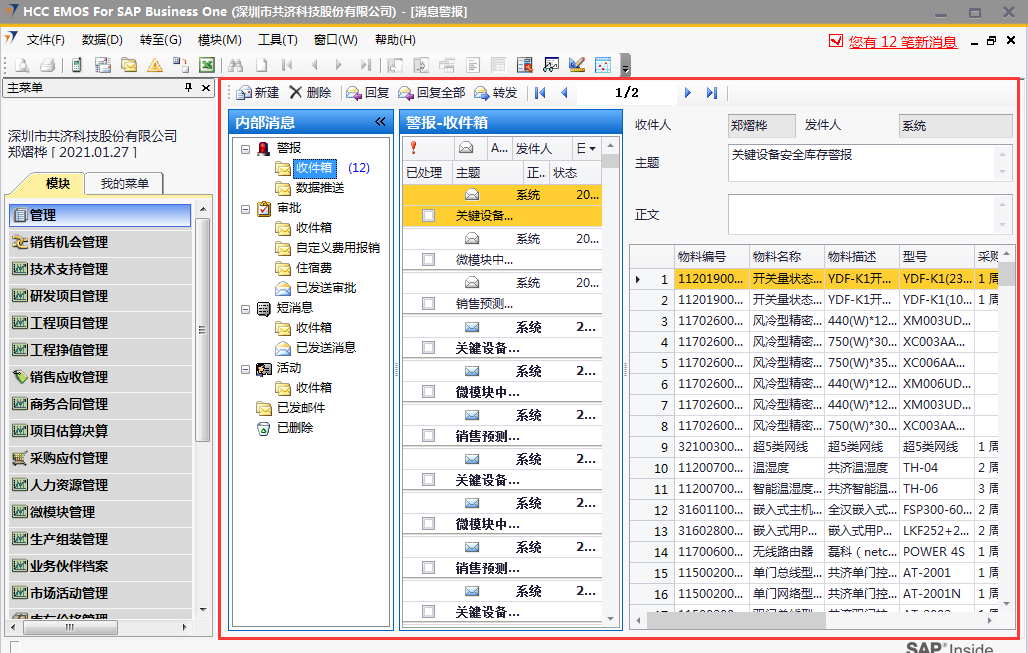 点工具栏,可查看消息警报 或点“您有X笔新消息”,也可查看消息警报  如下为效果图,请及时查看和留意警报 、审批及短消息内容